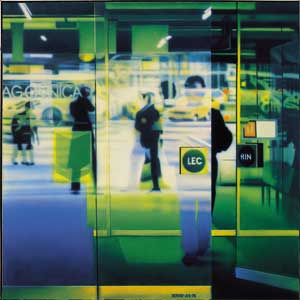 Komentar: bolj intimna motivika; na sliki njegov sin, ampak kot odsev na steklu; sicer pa le ena od slik z odsevi na steklenih vratih in izložbah. Podobe, ki bi težko nastale brez fotografije. Fotografija nastane hipno in prizor, ki tako hipno izgine kakor se pojavi, kakor npr. odsev v zapirajočih se vratih, lahko ujame le fotografija. Podobne prizore so v tem času obdelovali tudi fotografi, npr. Miško Kranjec, v mednarodnem prostoru pa je npr. najbolj znan ameriški fotograf Lee Friedlander. Tu ni več kaj prida pop-arta razen morda eventualnih nalepk, napisov in reklam, ki se po naključju ujamejo v kader. Pop art je zelo vezan na objekt, izdelek, sorazmerno trdno konstruiran in precej veristično podan, medtem ko imamo tu opravka ponovno s posredno sliko realnosti, pravzaprav z brezpredmetnim svetom tanke vidne opne odsevov, ploskev svetlobe in barvnih lis, v katere razpade stvarnost. Odmik od realnosti je dobil torej še eno fazo. Zdaj gredo členi verige od stvarnosti do slikane slike v tem zaporedju: realnost - odsev v steklu – fotografija – slika.